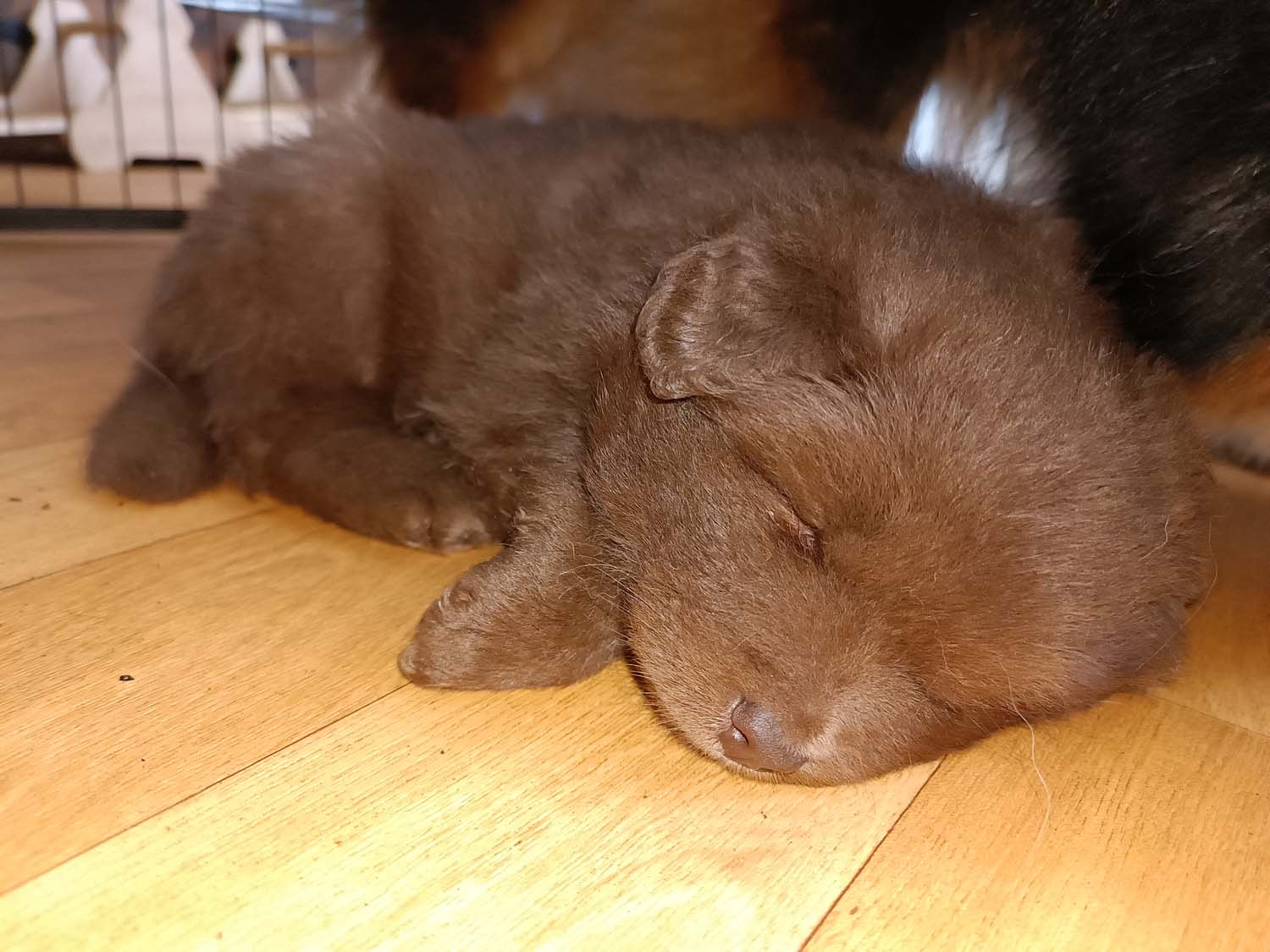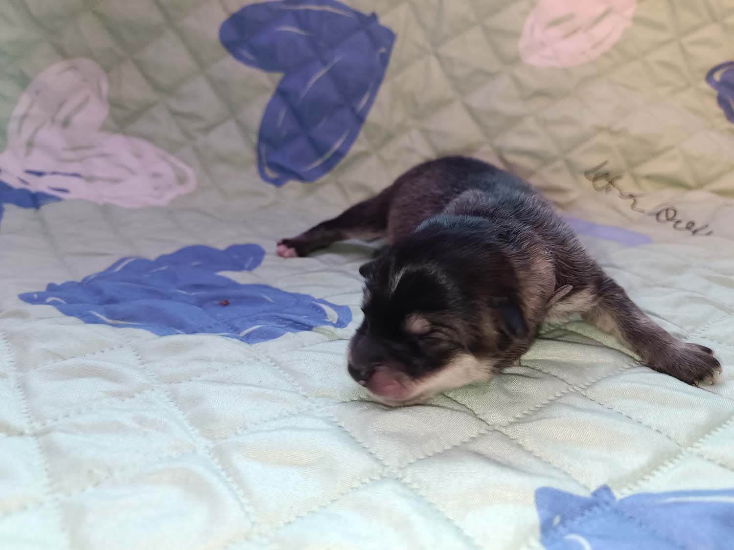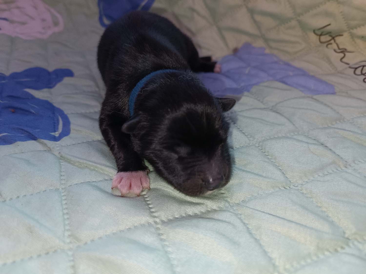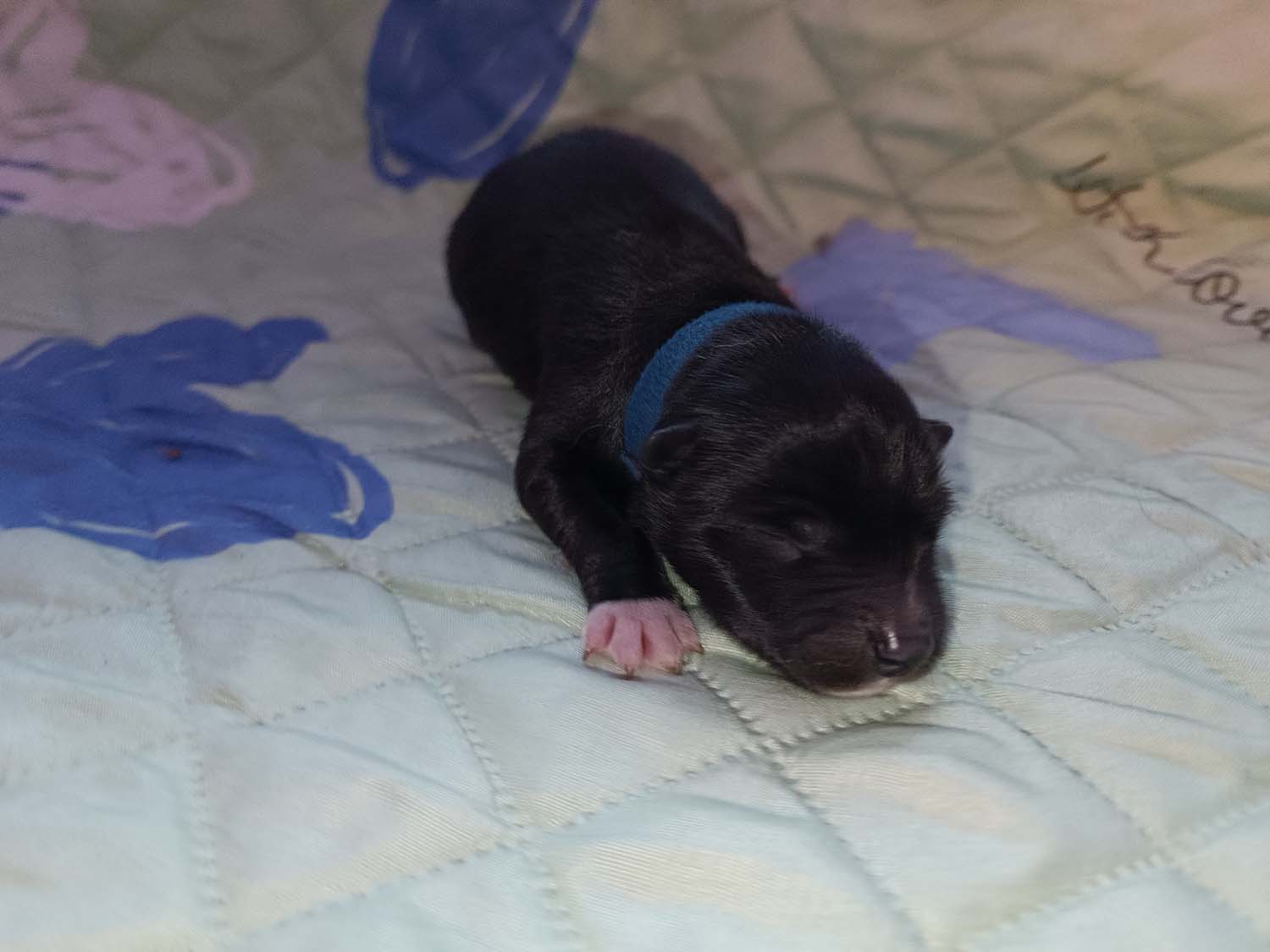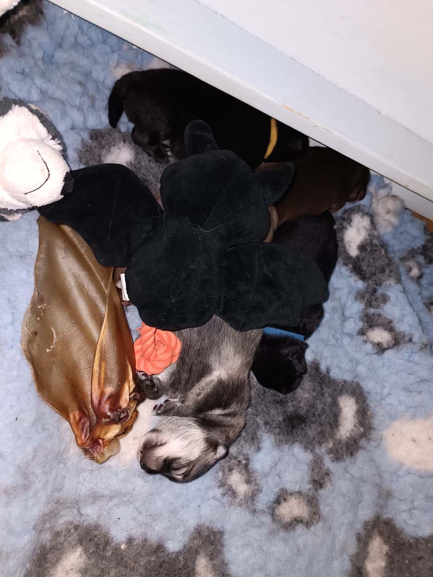 Bei der 3. Hündin bin ich mir noch nicht sicher welche Farbe sie mal haben wird. Ich denke schwarz, die Besitzerin vom Deckrüden meint sie erkenne ganz dezente Tan-Abzeichen. Ich sehe sie nicht wirklich, ich könnte theoretisch einen Gen-Test machen, dauert etwa 4-5 Wochen, bis dahin vermute ich aber dass wenn es wirklich tan abzeichen sind, sie deutlicher werden. Diese Abzeichen bilden sich auch erst innerhalb des ersten Lebensjahres richtig aus.