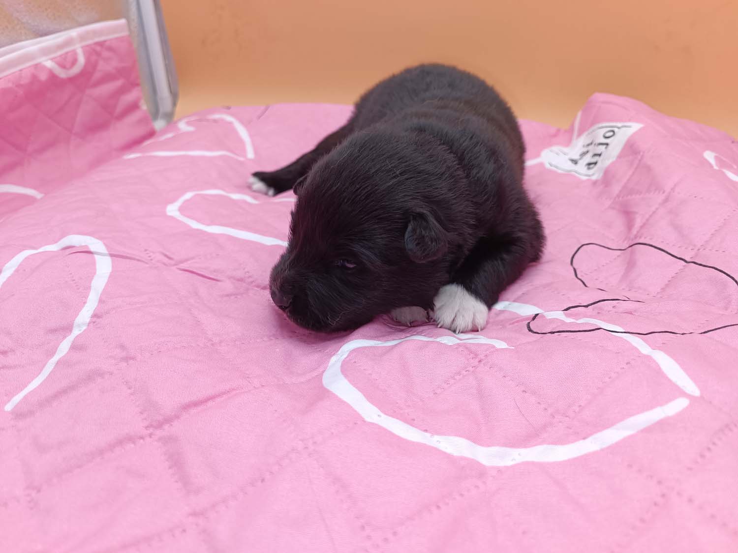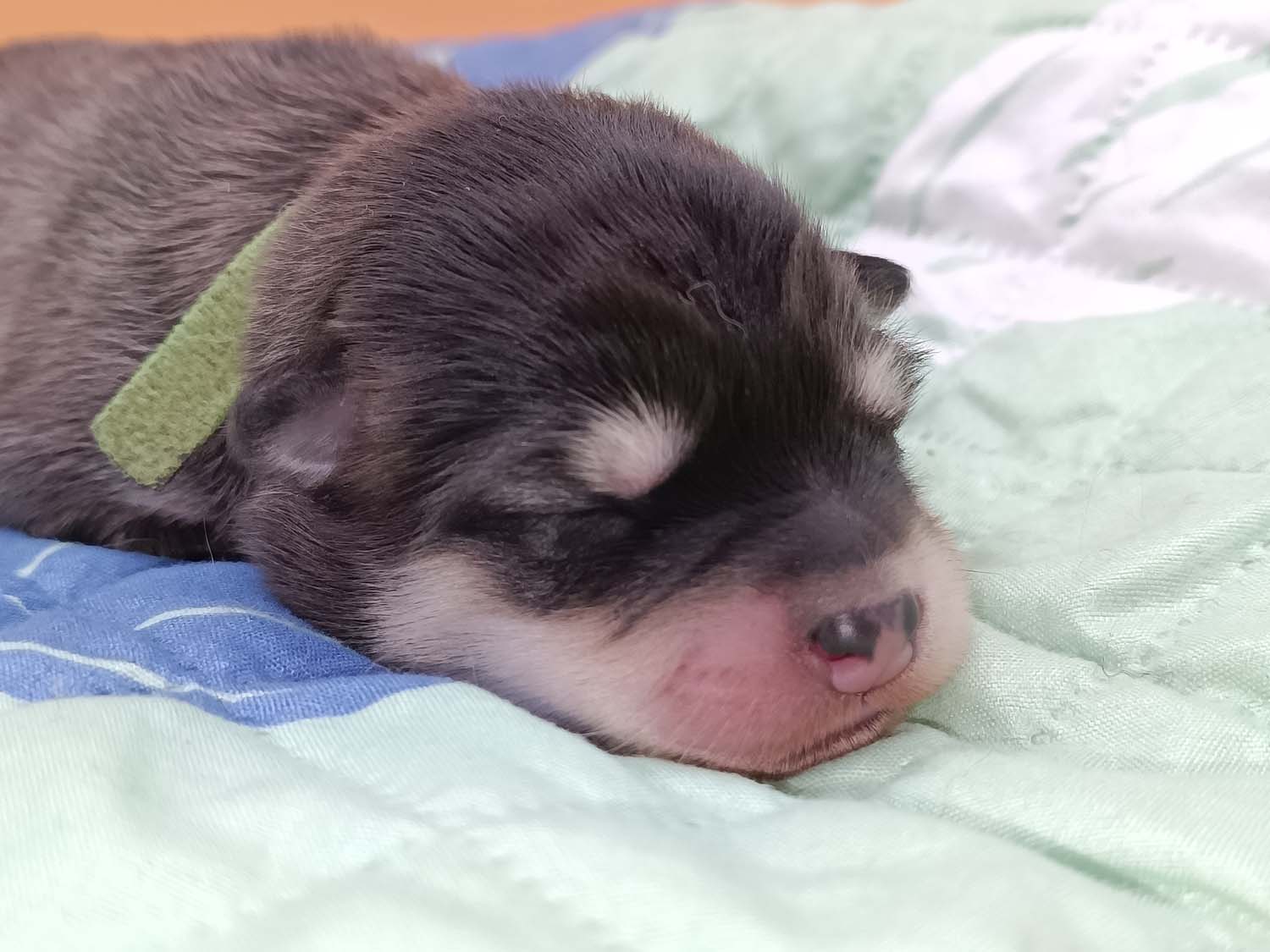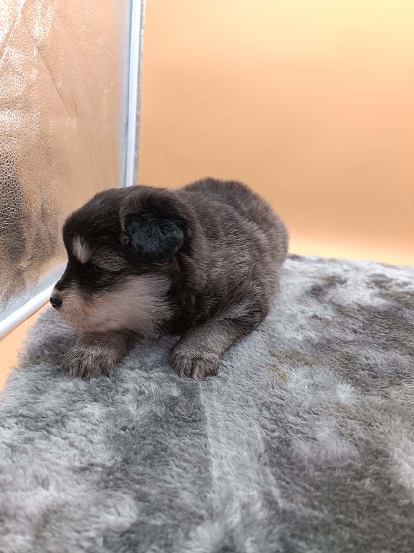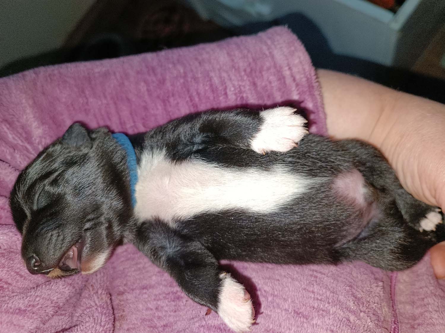 Bei der 3. Hündin bin ich mir noch nicht sicher welche Farbe sie mal haben wird. Ich denke schwarz, die Besitzerin vom Deckrüden meint sie erkenne ganz dezente Tan-Abzeichen. Ich sehe sie nicht wirklich, ich könnte theoretisch einen Gen-Test machen, dauert etwa 4-5 Wochen, bis dahin vermute ich aber dass wenn es wirklich tan abzeichen sind, sie deutlicher werden. Diese Abzeichen bilden sich auch erst innerhalb des ersten Lebensjahres richtig aus.