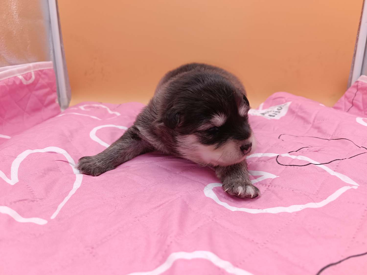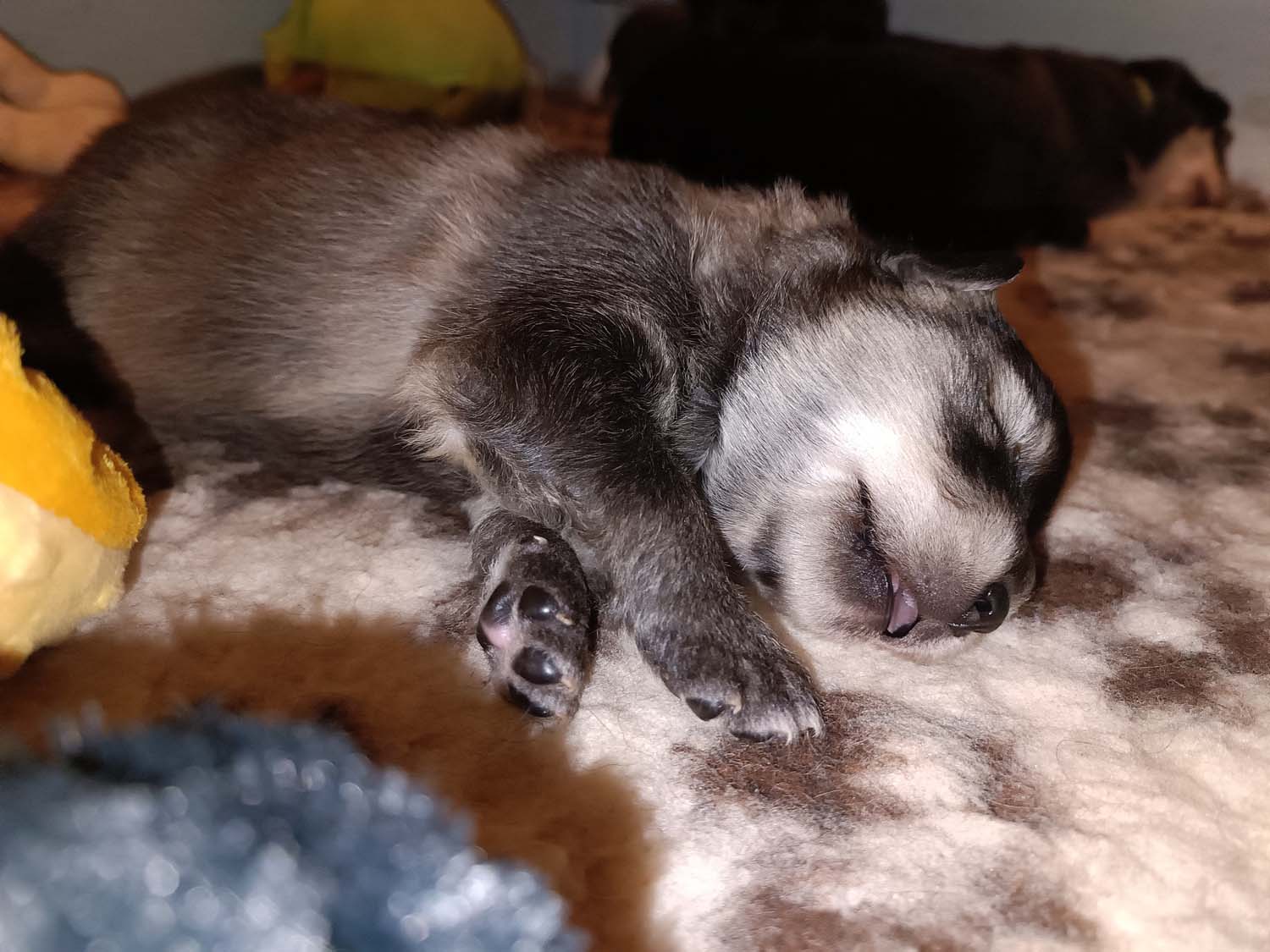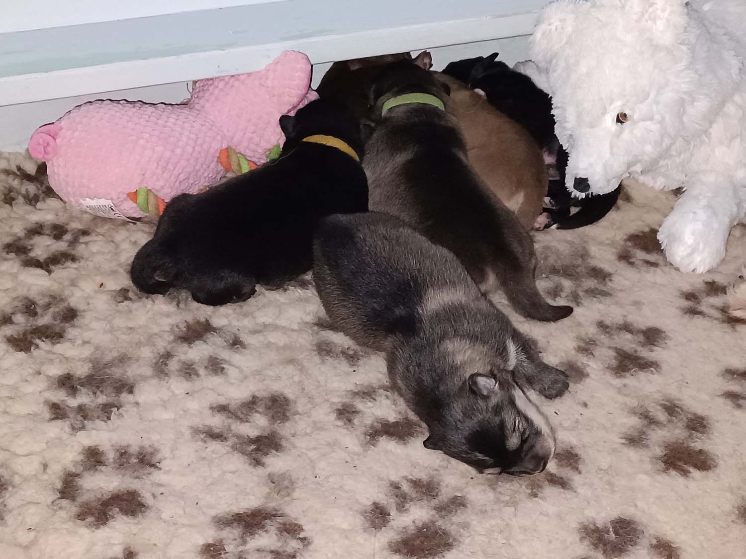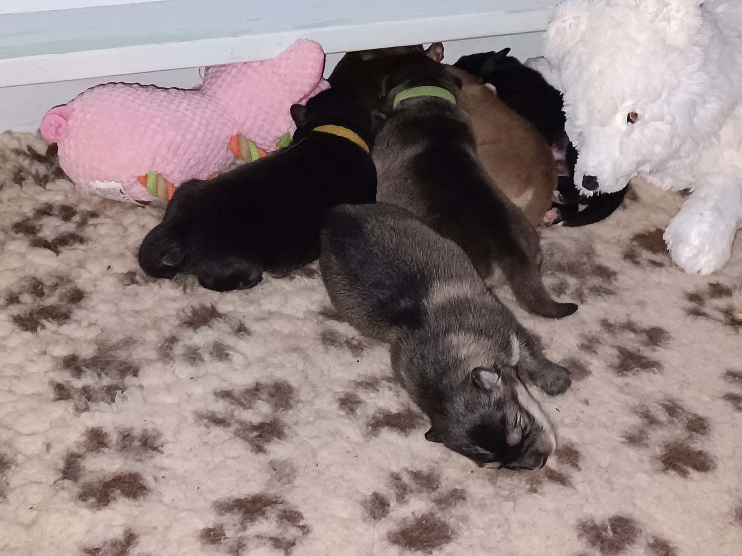 Die Welpen sind nun schon wieder 12 Tage alt und wachsen wie am Spieß. Klein Hatysa hat mich heute auch schon mit einem Auge angezwinkert. Die beiden dicken Mädels haben die Marke Mehltüte geknackt aka wiegen mehr als 1 kg jetzt und ähneln doch eher Robben als Hunden. Man sieht in den Fotos/Video auch, dass einige Plüschtiere in der Wurfbox eingezogen sind, die Welpen spielen noch nicht damit, es dient als Kissen bzw. als Hinternisse, damit die Welpen nicht immer komplett flach wie kleine Flundern liegen. Dieses Flache liegen, kann zu einem abflachen des Brustkorbes führen, was nicht wirklich ideal ist.