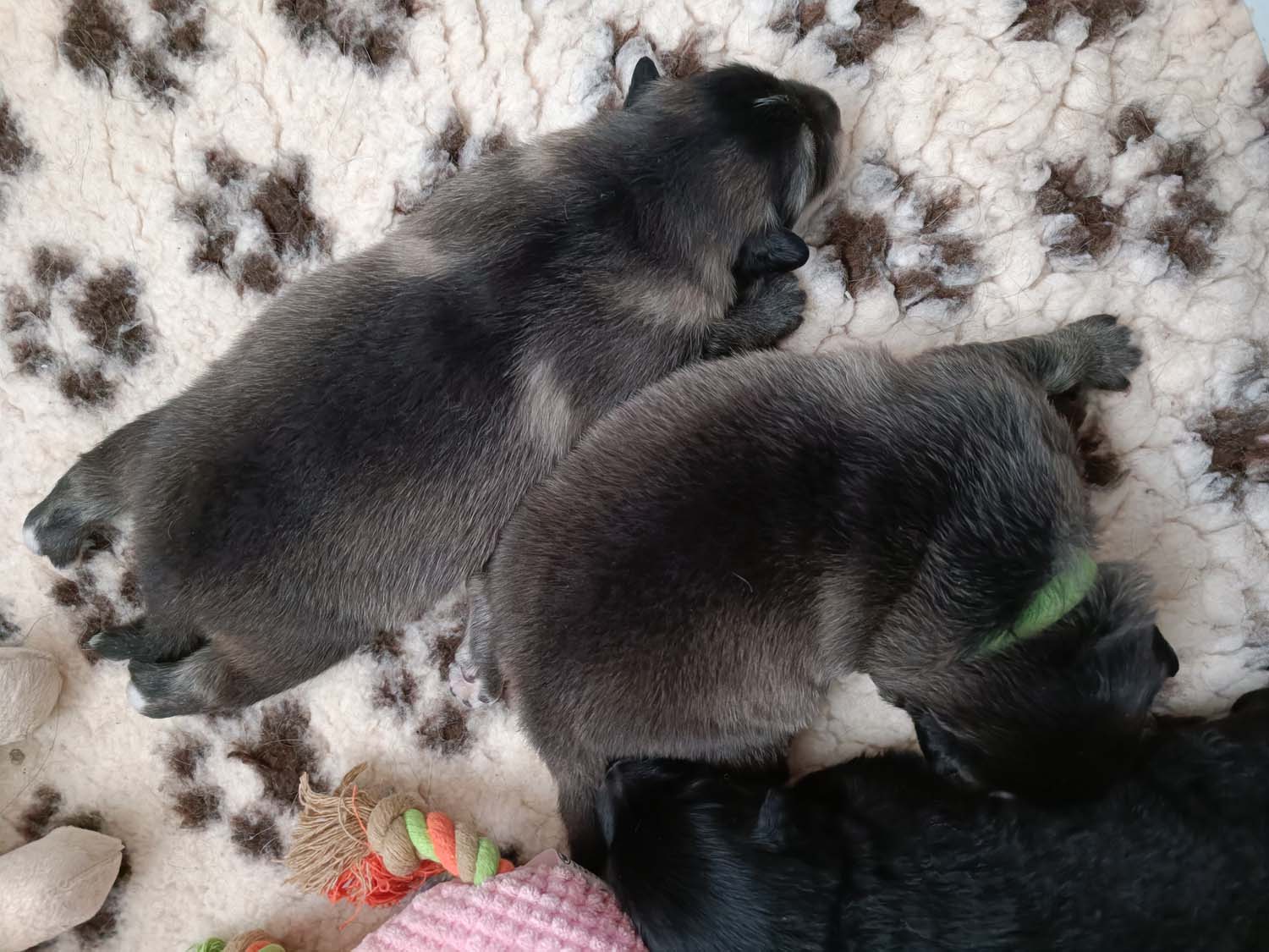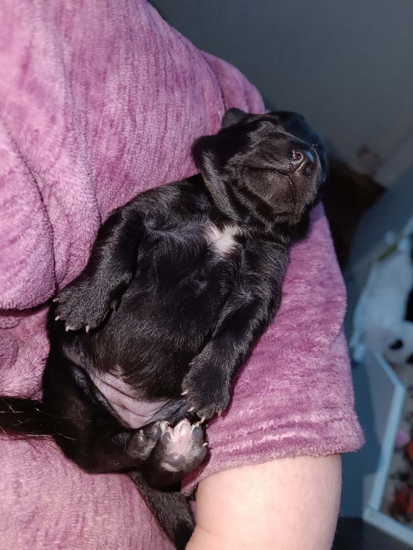 Nachdem Hexe die ersten Tage sehr zickig unterwegs war, bin ich am Montag zur Tierärztin gefahren, um den Calcium-Wert bestimmen zu lassen. Manchmal kann es durch einen niedrigen Calciumwert zu Zickigkeit kommen, der war aber im Normbereich und die letzten beiden Tage ist sie auch etwas ruhiger geworden. Zickt zwar die anderen Hunde trotzdem noch an, aber nimmt sich nun auch mal 5min Auszeit und kommt zum kuscheln. Allerdings ich gebe es zu, man möchte nicht unbedingt von ihr momentan angehechelt werden. Das Putzen der Kleinen hinterlässt einen etwas intensiven Atem. Solange die Welpen ruhig sind, kann ich auch nun die Welpen aus der Wurfbox nehmen, ohne das Hexe sofort hinterher springt. Diese drei, sind meine Genießer, und beim Bauchkraulen direkt mal eingeschlafen. Die drei Dominos waren da nicht ganz so ruhig und das verursacht, dann doch noch Stress bei Hexe.