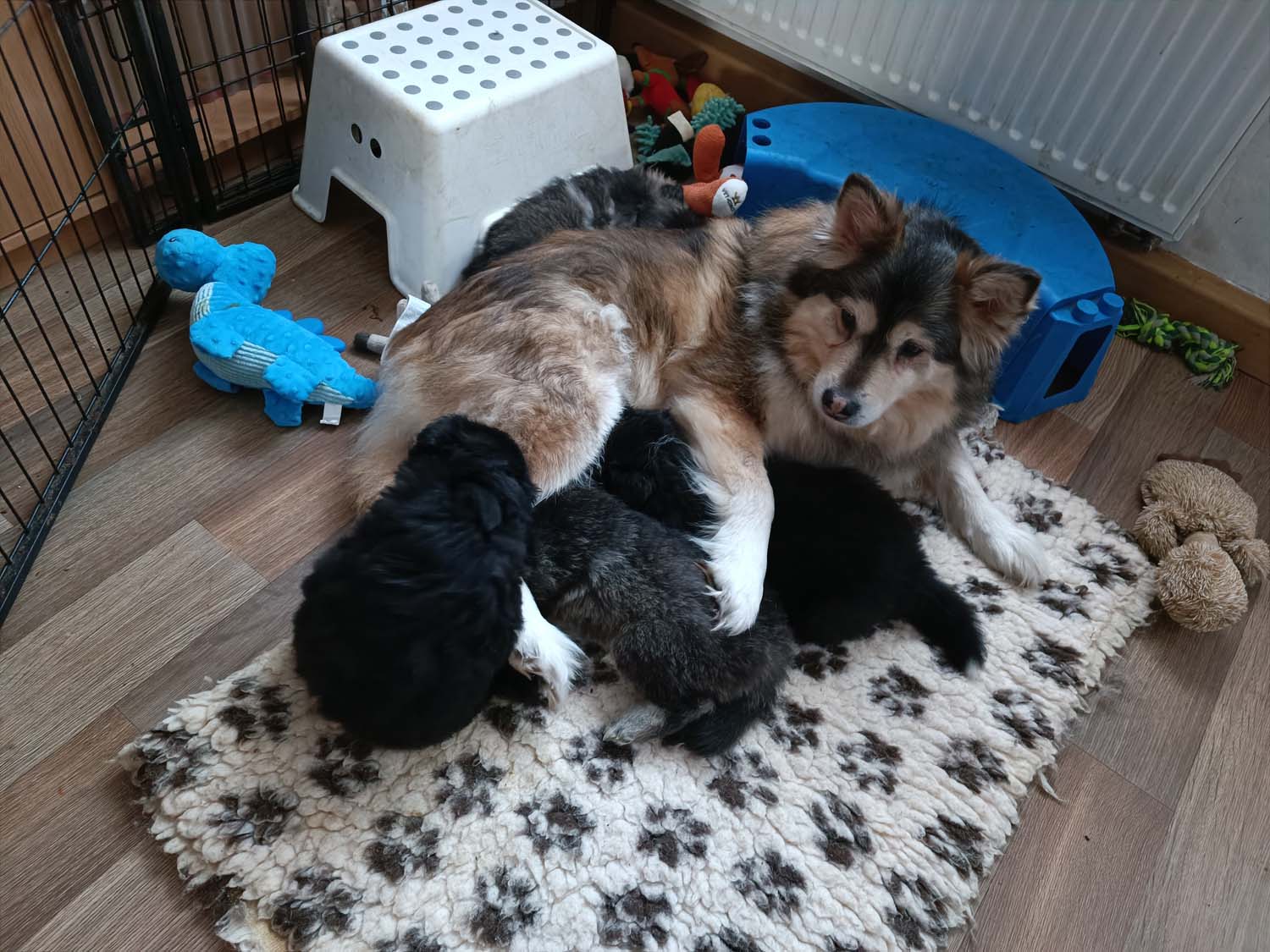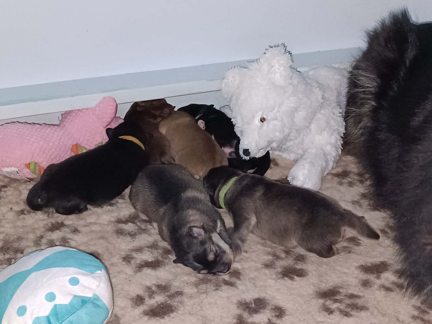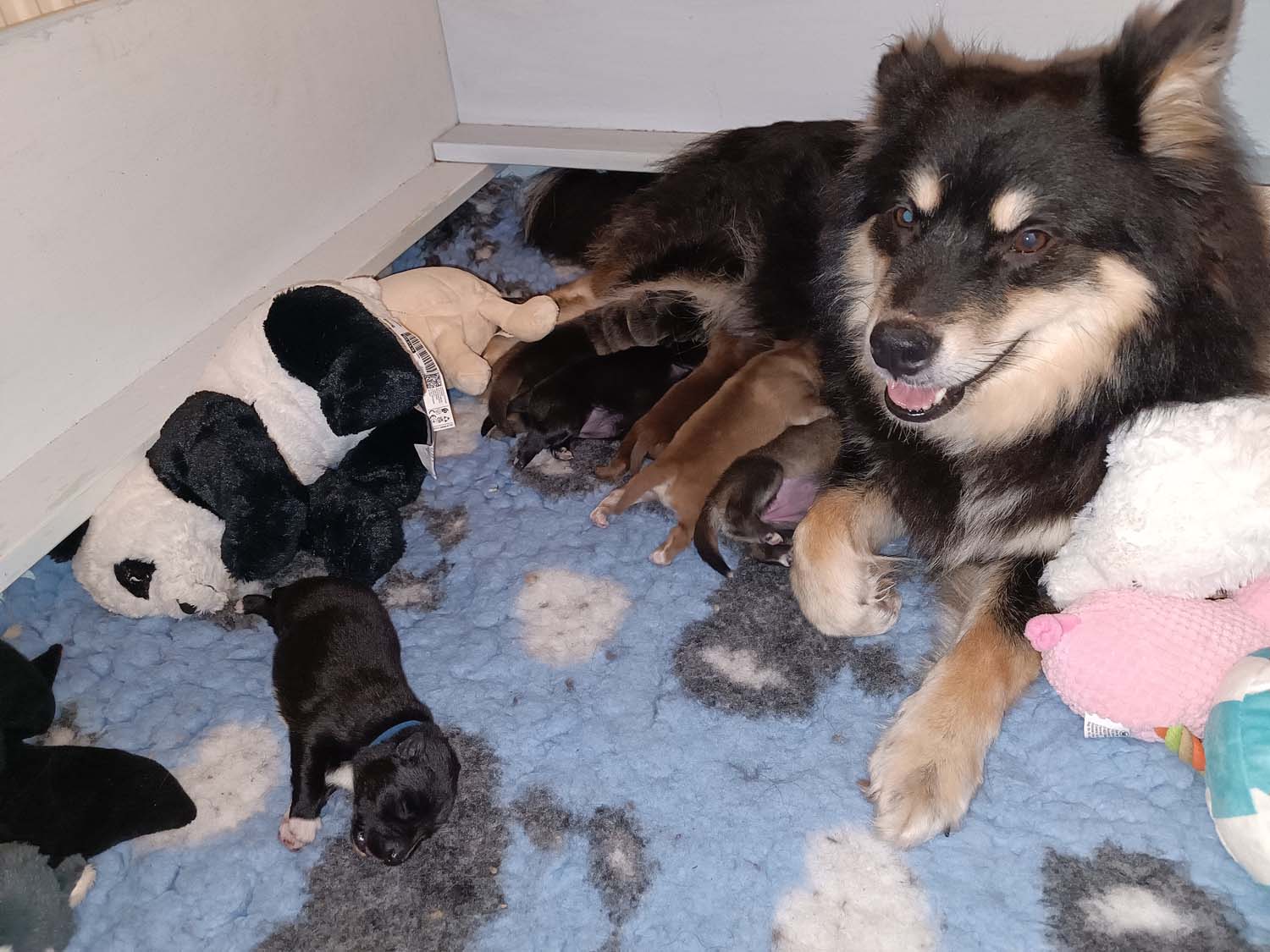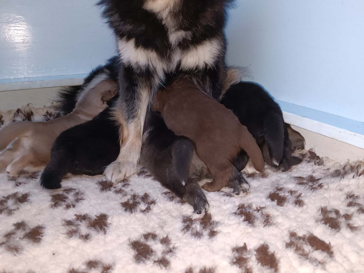 Hexi hat gestern in den frühen Morgenstunden 6 Welpen das Leben geschenkt. Die Welpen kamen zwischen kurz vor 4 und 6.30 im sehr zügigem Abstand zur Welt. Hexe hat eine super Arbeit gemacht und ich musste nur 1 mal kurz eingreifen um eine Fruchthülle zu öffnen. Ansonsten hat sie die Geburt absolut selbstständig über die Bühne gebracht.