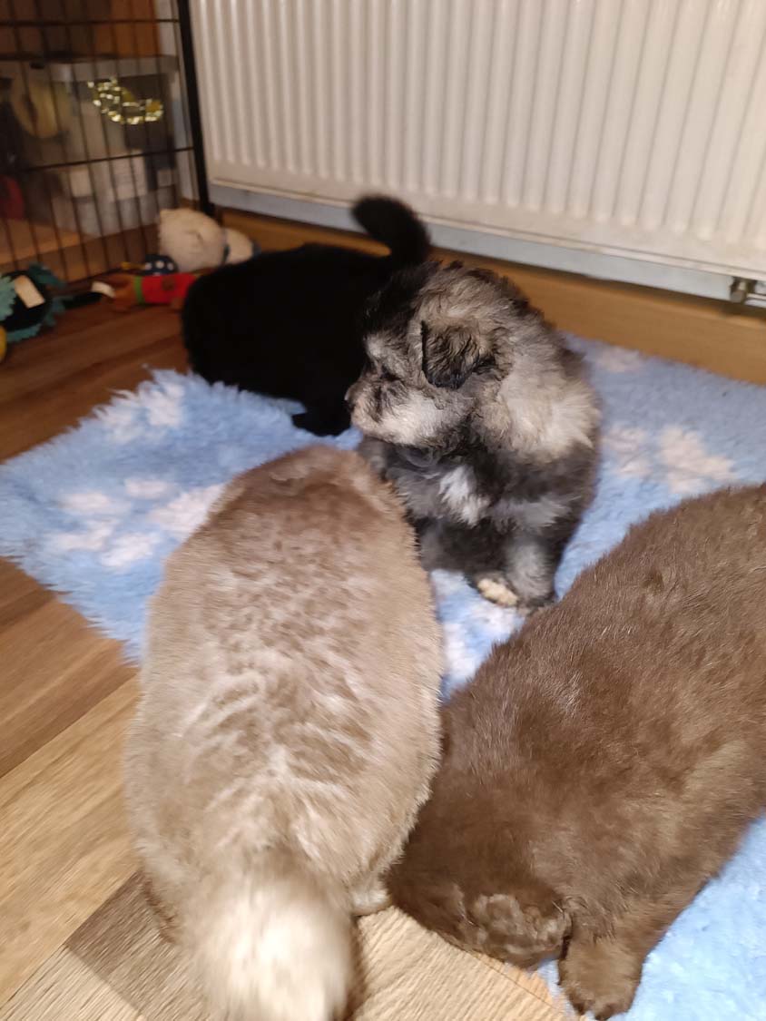 Ich bin gefragt worden warum ich die Welpen immer von außerhalb filme, denke nicht, dass jemand Interesse hat für 10min meine Füße und Bein zu betrachten ;). Die Welpen suchen nun immer mehr auch aktiv den Kontakt zu mir.