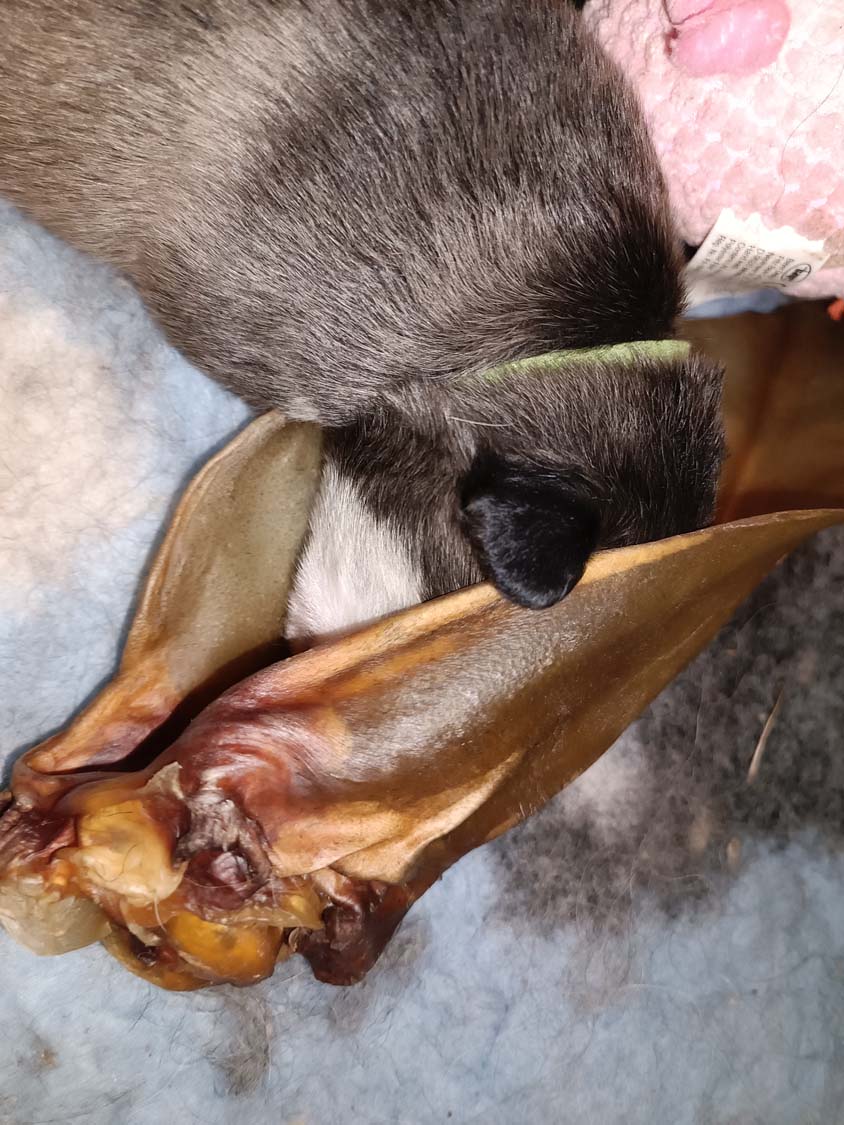Kurze Story. Am Freitag, hatte ich den Großen Rinderohren zum knabbern gegeben. Hexe hat sich erst eins geholt, kam dann aber wieder und wollte noch ein zweites. Hexe bekommt was sie möchte, also hab ich ihr ein zweites Rinderohr gegeben. Das sie dann in die Wurfbox geschafft hat. Nur leider wissen die Zwerge noch nichts damit anzufangen und als Kuschelkissen ist es nicht ganz so geeignet. Am nächsten Tag war Hexis Appetit dann aber doch zu groß und sie hat es selbst geknabbert.
