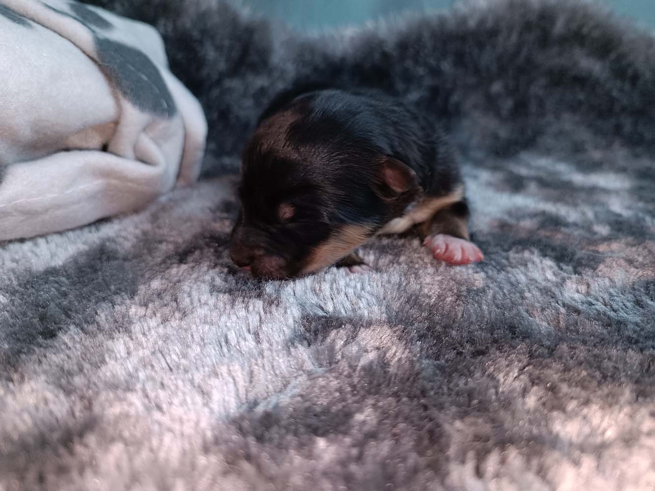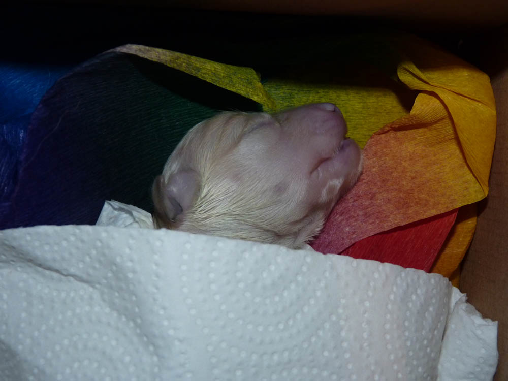 Beschreibung:Klein Georgina war die leichteste Hündin im 10er Wurf von Sunny. Leider überlebte sie die erste Nacht nicht. Warum, weiß ich leider nicht. Run Free, Kleine Maus.