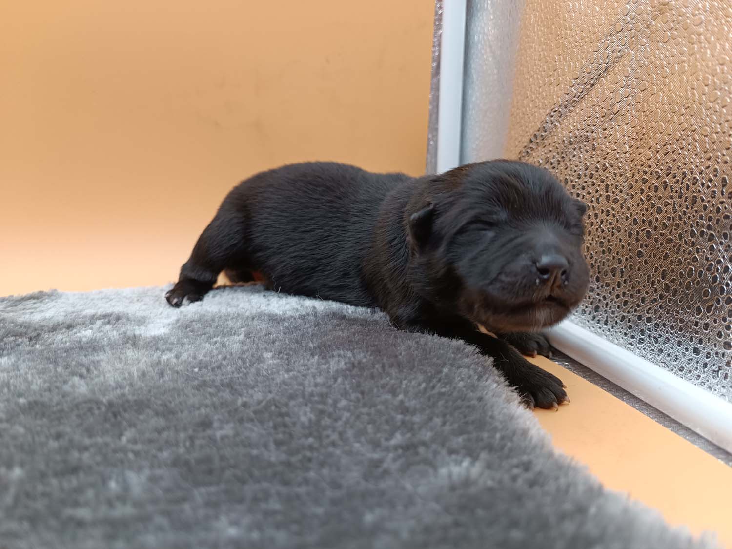 Bei der 3. Hündin bin ich mir noch nicht sicher welche Farbe sie mal haben wird. Ich denke schwarz, die Besitzerin vom Deckrüden meint sie erkenne ganz dezente Tan-Abzeichen. Ich sehe sie nicht wirklich, ich könnte theoretisch einen Gen-Test machen, dauert etwa 4-5 Wochen, bis dahin vermute ich aber dass wenn es wirklich tan abzeichen sind, sie deutlicher werden. Diese Abzeichen bilden sich auch erst innerhalb des ersten Lebensjahres richtig aus.